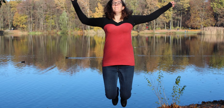 Das Herzshirt ist bei der Teilung ein bisschen kniffeliger zu nähen. Eigentlich soll man die Spitze mit der Nähmaschine nähen – im Prinzip wie einen V-Ausschnitt. Das hat bei mir aber überhaupt nicht geklappt. Deswegen bin ich da einfach beherzt mit der Overlock drübergegangen. Jetzt ist die Spitze zwar eher rund, aber es stört mich nicht. Ich finde, es sieht trotzdem schick aus – abgesehen davon, dass mir erst nach dem Nähen aufgefallen ist, dass das Oberteil stark nach Minnie Maus aussieht. Egal, ich steh dazu! Aber beim nächsten Mal nehme ich eine andere Farbkombi.
