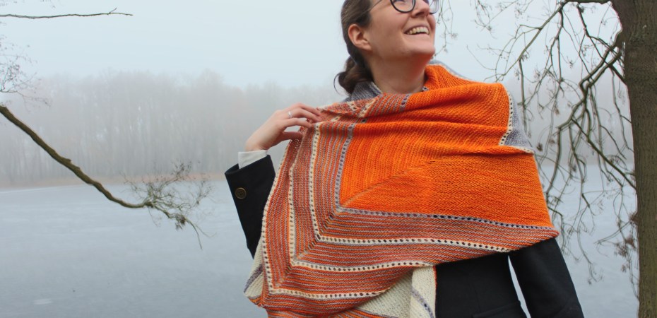 Nun ist die Aussage, dass das Garn nicht gereicht hat, relativ. Das Tuch endet in einer schmaler werdenden Spitze mit Streifensequenzen, die durch ein Lochmuster getrennt werden. Die Anleitung macht keine Angaben darüber, wie viele dieser Streifensequenzen man stricken soll, es heißt einfach „bis zur gewünschten Länge“ stricken. Wenn ich aber das in der Anleitung abgebildete Tuch mit meinem vergleiche, fehlen meinem zwei komplette Streifensequenzen und drei Streifen von der letzten Streifensequenz, für die meine Wolle noch gereicht hat. Das Mustertuch hat sechs Streifensequenzen, ich hab es bei meinem Tuch nur auf vier gebracht, wobei die letzte unvollständig ist. Das finde ich ein bisschen schade, denn so fehlt es meinem Tuch doch ein bisschen an Länge. Ansonsten bin ich aber sehr zufrieden mit meinem Verum – es ist ein schöner Farbklecks im grauen Winter!
