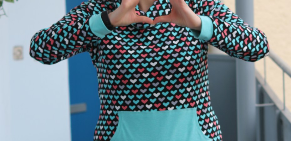 Meine zweite Frauke, ebenfalls mit dem überlappenden Kragen und Bauchtasche, habe ich aus Sommersweat genäht. Das ist derzeit mein Lieblingsmaterial. Es lässt sich super verarbeiten und trägt sich durch die nicht angerauhte Seite sehr angenehm auf der Haut. Den Stoff mit den Herzen habe ich online schon eine ganze Zeit angesabbert und bin dann schließlich schwach geworden, als ich ihn vor Ort bei der Traumbeere live gesehen habe.