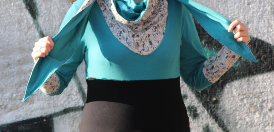 Das Shirt ist mir kurz nach seinem Erscheinen bei Facebook über den Weg gelaufen. Ich fand die Idee sehr witzig, ein Shirt mit eingebautem Halstuch zu nähen. Ich bin ja bekannlich eine ziemliche Frostbeule.