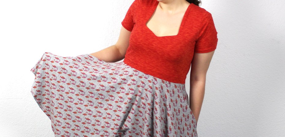Nach dem ersten wolkenlosen Zuckerstück hatte ich Feuer gefangen und musste gleich noch eins nähen – diesmal mit einem leicht gekürzten Oberteil, damit die Taillenpasse  etwas höher sitzt. Für das „Finalstück“ habe ich mich beim Glückpunkt-Shop mit Stoffen eingedeckt. Der Flamingojersey hat mir sofort gefallen, ich war mir aber unsicher mit dem Kombistoff. Online ist das ja immer so eine Sache, auf dem Bildschirm sehen Farben ja oft anders aus als in der Realität. Aber für mein Kombiproblem gab es zum Glück Mirja vom Glückpunkt.