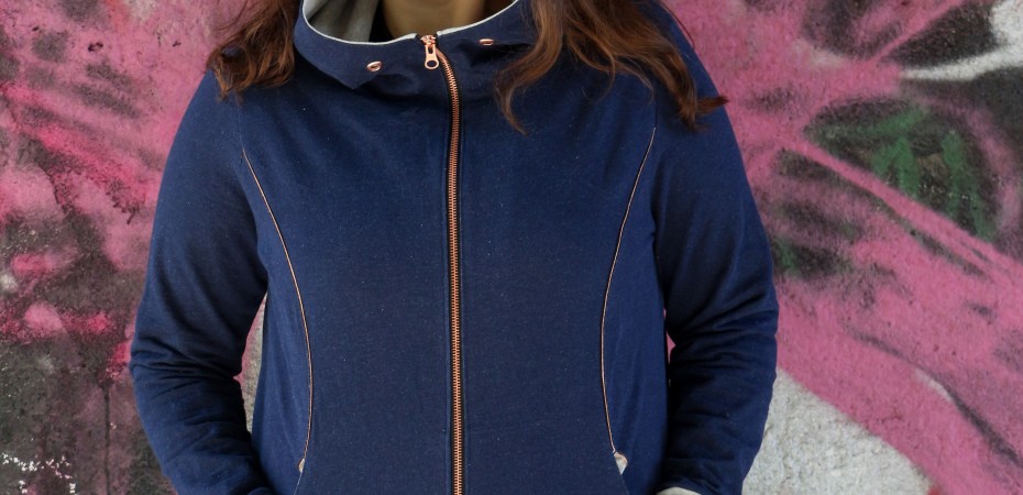 Nachdem mein Probeteil schon so schön geworden ist, habe ich mich an das erste finale Teil gemacht. Wieder in der Variante als Jacke mit Einsätzen, diesmal aber mit Kapuze statt Kuschelkragen. Verwendet habe ich dafür einen wirklich super schönen indigoblauen Sommersweat von Wunderland der Stoffe. Den Stoff kann ich wirklich schwer beschreiben, er hat in Optik aber auch in der Haptik etwas von Jeans, ist aber dehnbar wie ein Sommersweat.