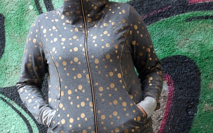 Auch meine dritte Nanuk-Jacke habe ich aus French Terry genäht. Den Stoff habe ich – wie schon den genialen indigofarbenen Sommersweat von meinem „angekupferten Nanuk“ – bei Wunderland der Stoffe gefunden. Wie beim Kupfer war es auch hier ein Krampf, passenden Tüddel in Gold zu finden. Ich sage euch, elastische Paspeln in Metallfarben sind DIE Marktlücke schlechthin. Irgendjemand sollte sowas ganz ganz dringend produzieren. Ich musste mir für die Paspelierung der Taschen wieder mit Baumwollschrägband behelfen. Ja, das geht auch, aber eine Paspel wäre komfortabler gewesen.