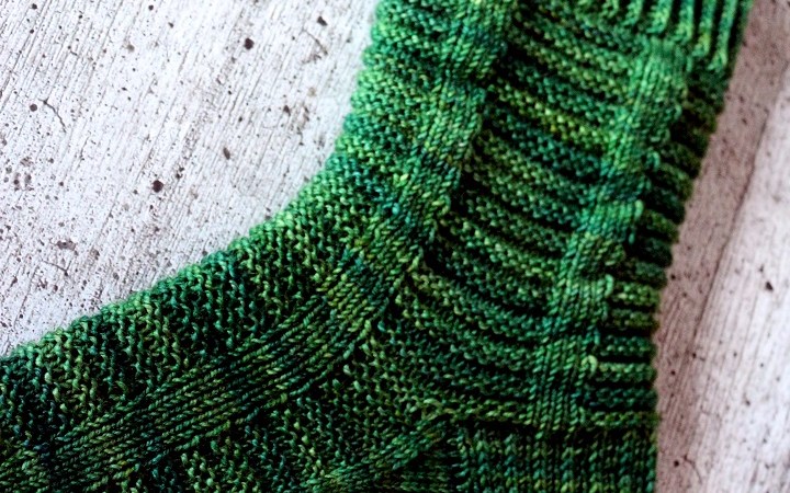 Grønn ist ein simples, graphisches Muster, das nur aus rechten und linken Maschen besteht. Mir gefällt es sehr gut, weil es sehr dezent ist und nichts von der tollen Färbung schluckt. Die Anleitung habe ich etwas abgewandelt und statt der Bumerangferse eine klassische Käppchenferse gestrickt. Ich kann mich mit der Bumerangferse einfach nicht anfreunden, irgendwie sitzt die bei mir nicht. Für den Maschenanschlag habe ich, wie fast immer bei meinen Sockenprojekten, Jeny’s Surprisingly Stretchy Cast On verwendet, der sehr elastisch ist und dafür sorgt, dass die Socke auch gut über die Ferse geht.
