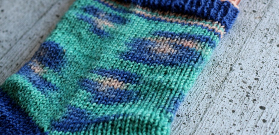 Den Maschenprobenmuffel in mir hat es außerordentlich beruhigt, dass man keine richtige Maschenprobe, also so ein sinnloses Läppchen, stricken muss. Die Maschenprobe macht man beim eigentlichen Stricken der Socke. Das haben die Erfinder des Sockengarns sehr clever gelöst: Nach dem Bündchen hat die Wolle mehrere verschiedene Farbabschnitte. Jeder dieser Farbabschnitte ist, wenn man die richtige Maschenprobe schafft, genau eine gestrickte Runde lang. An dieser Stelle hat man also Zeit, verschiedene Nadelstärken auszuprobieren. Ist ein Farbabschnitt vor Erreichen des Rundenendes zu Ende, muss man mit der Nadelstärke runtergehen, kommt man mehr als eine Runde weit muss man mit der Nadelstärke hoch.