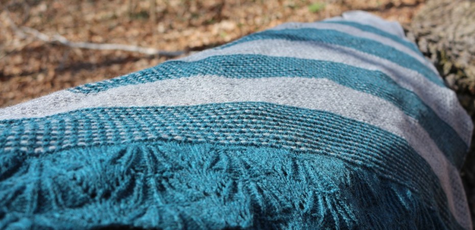 Im Tuch werden verschiedene Muster miteinander kombiniert: gestartet wird an der langen Kante mit einem Lacemuster, das ein wenig Struktur gibt und dann wechseln sich ein Mosaikmuster und ein sehr offenes Lacemuster ab, während man kontinuierlich Maschen abnimmt.