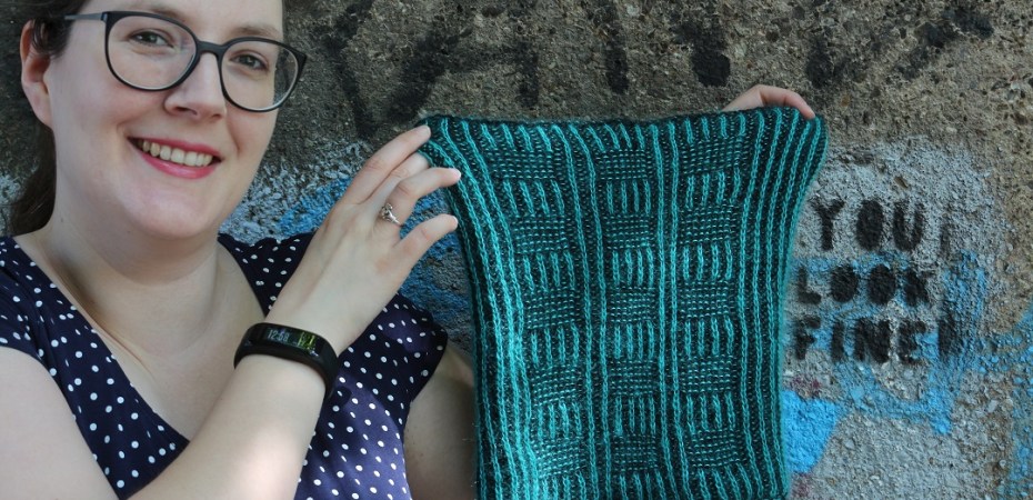 Mein Cowl trägt den Namen „Flauschrausch“ – und der Name ist Programm, denn er fühlt sich unheimlich leicht und flauschig an. Er ist auch ein echtes Leichtgewicht, denn insgesamt habe ich dafür nur 23g Shimo und 17g Sensai verbraucht. Basismuster für meinen Cowl ist zweifarbiges Brioche (auf Deutsch: Patent), das sehr plastische Längsstreifen bildet. Aufgelockert habe ich das Design mit ein paar kraus rechts gestrickten Vierecken, die dem ganzen noch eine interessante Optik verleihen.