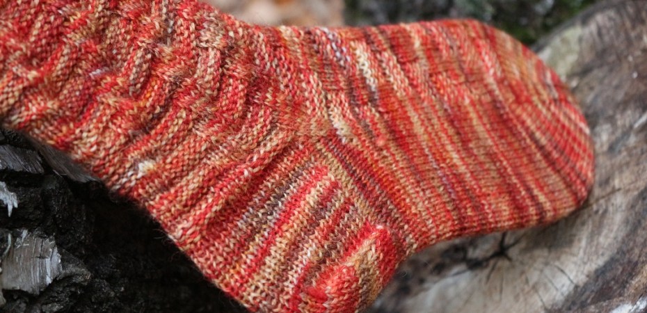 Das ist ein im Grunde sehr simples Muster, das nur aus rechten und linken Maschen besteht. Aber indem die Maschen immer wieder versetzt werden, entsteht optisch so eine Art Zopf – zumindest, wenn die Socke nicht durch das Anziehen stark gedehnt wird. Total einfach, aber ein cooler Effekt. Das Muster ist außerdem sehr eingängig, nach ein paar Reihen hat man es drauf und kann ohne Anleitung stricken. Da ich zum #teamkäppchen gehöre, habe ich meinen Socken natürlich ein Käppchen verpasst, das mag ich einfach am liebsten. Und die Spitze ist eine Bandspitze, wie ich sie von Oma gelernt habe.
