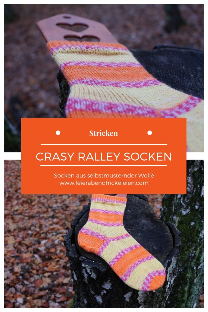 Ich bin ja, wie ihr wisst, nicht empfindlich, was Wolle angeht. Die Ralley hat die Standard 75% Wolle / 25% Poly Sockenmischung und fühlt sich für mein Empfinden gut und überhaupt nicht kratzig an. Mir gefällt die Mustergebung gut, denn die Streifen sind – bis auf den pinken „Ralley-Streifen“ sehr lang. So können die Farben wirken und die Socke ist nicht zu unruhig.