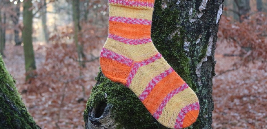 Ich bin ja, wie ihr wisst, nicht empfindlich, was Wolle angeht. Die Ralley hat die Standard 75% Wolle / 25% Poly Sockenmischung und fühlt sich für mein Empfinden gut und überhaupt nicht kratzig an. Mir gefällt die Mustergebung gut, denn die Streifen sind – bis auf den pinken „Ralley-Streifen“ sehr lang. So können die Farben wirken und die Socke ist nicht zu unruhig.