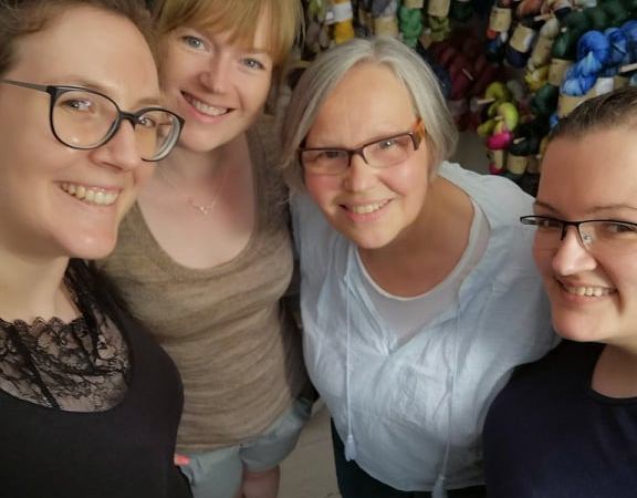Neben den „Industriegarnen“ hat Sabine auch handgefärbte Garne im Sortiment. Sie bietet unter anderem Garne von Tulliver Yarns an, das sind pflanzengefärbte Garne mit einer wunderschönen Farbpalette, die in Berlin/Brandenburg handgefärbt werden. Sabine ist aber auch selber Handfärberin und ihre Garne bieten einen Schwerpunkt in ihrem Sortiment. Besonders gut gefallen hat mir, dass Sabine, die ihr Rohmaterial aus Großbritannien bezieht, auch ein paar unbekanntere Garnsorten färbt und anbietet. Natürlich hat sie die üblichen reinen Merinogarne und Sockenwoll-Mischungen im Angebot, aber auch Seide-Mohair, Wensleydale oder Falkland Merino und Blue Faced Leicester. Das ist mal was anderes und geht über das „übliche“ Sortiment vieler Handfärber*innen hinaus.