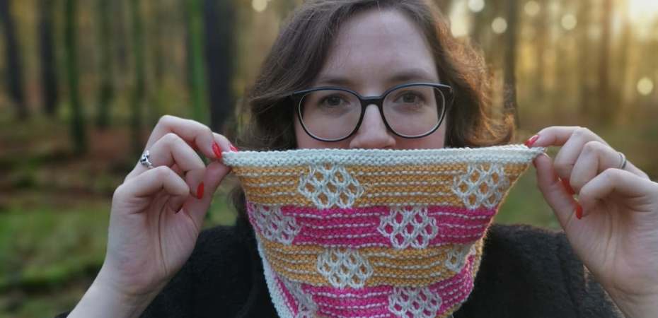 Auch das Muster sollte an den Frühling erinnern. Was liegt da näher als Blümchen? Die Blümchen auf dem Cowl entstehen aus abgehobenen und verkreuzten Maschen – total simpel und intuitiv (vertraut mir, ihr werdet ganz schnell nicht mehr ins Strickmuster schauen müssen!). Damit der Cowl trotz seiner Frühlingshaftigkeit gut wärmt, habe ich ihn mit linken Rippen konzipiert. Dadurch bekommt er – zusammen mit einem relativ festen Gestrick – einen guten Stand und bleibt am Hals, wo er soll.