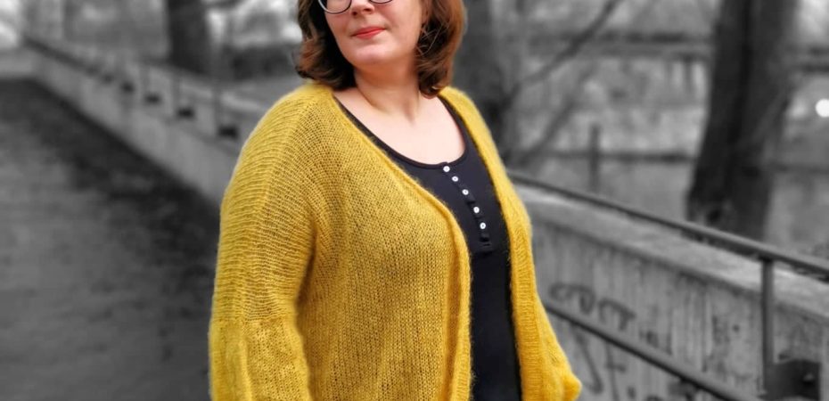 Ich habe im Knit Along tatsächlich zwei Strickjacken geschafft, heute stelle ich euch die erste davon vor: Den Lotte Cardigan von Imke von Nathusius. Das Modell ist mir direkt ins Auge gesprungen, denn es ist ein schlichtes Basic-Jäckchen, dass man zu allem tragen kann – und bei dem man sich richtig mit der Farbe austoben kann. Die Jacke wird aus doppelt genommenem Mohair-Seide-Garn in Lacestärke gestrickt. Wenn man hier zwei Farben kombiniert kann man tolle Effekte erzielen. Ich habe mich für eine Ton in Ton Kombi aus zwei verschiedenen Gelb-Tönen der Lang Yarns Lace * entschieden. Eine Knallerkombi. Da die Jacke durch das Mohair auch super flauschig ist, heißt sie im Hause Feierabendfrickeleien nur noch „die Bibo Jacke“. Passt!