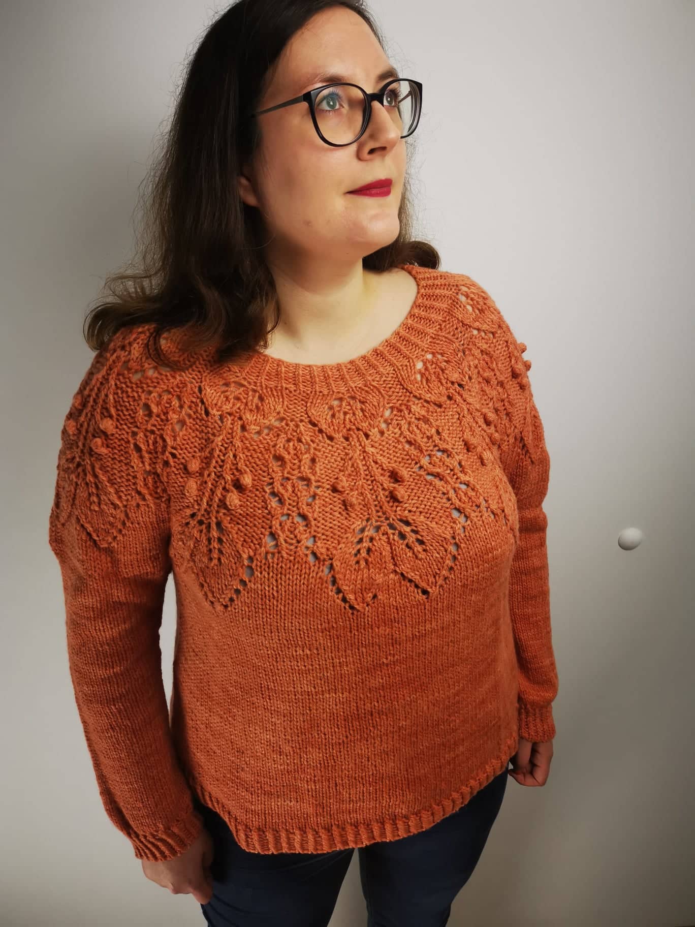 Das einzige, was mich tatsächlich ein bisschen stört, ist die Tatsache, dass durch das dicke Garn im Lacemuster die Umschläge naturgemäß auch recht große Löcher ergeben. Dadurch muss ich immer überlegen, was ich unter dem Pulli anziehe, denn ohne ein Unterhemd fühle ich mich damit irgendwie nackt (bescheuert, aber ist so). Ich habe immer noch nicht für mich entschieden, welches die beste Farbe zum drunterziehen ist, da man diese durch die großen Löcher in jedem Fall sieht. Weiß sieht irgendwie doof aus, finde ich. Ich schwanke zwischen nude und schwarz. Diese Unsicherheit hält mich aber nicht davon ab, den Pulli gerne zu tragen.