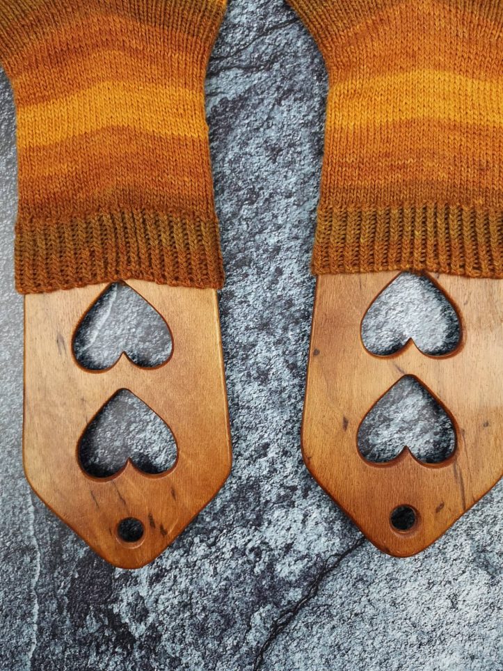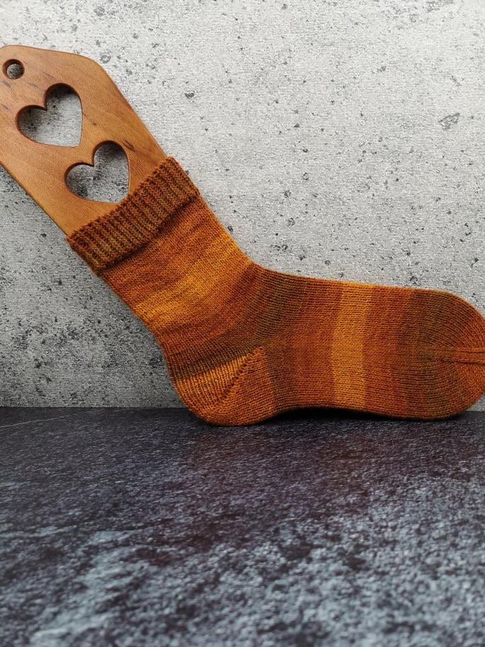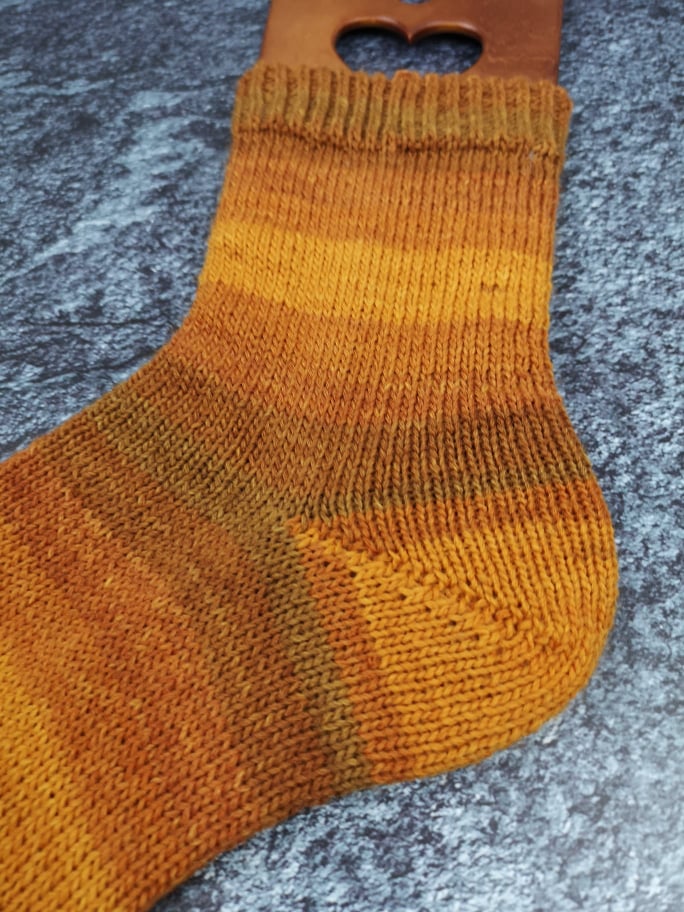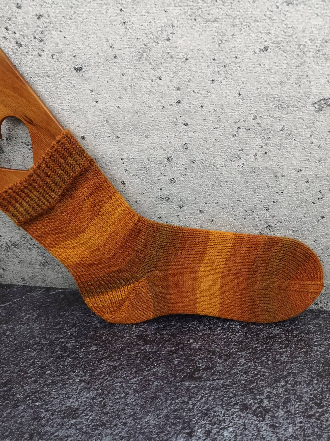 Ich habe meine Socken relativ oft an und die sehen nach mehreren Monaten noch so aus wie am Anfang. Ich habe mit 2,5 er Nadeln meine Standard-Maschenzahl verwendet und das hat gut gepasst. Die ungefärbte andere Sockenwolle vom Finkhof ist deutlich rustikaler, aber auch sehr haltbar