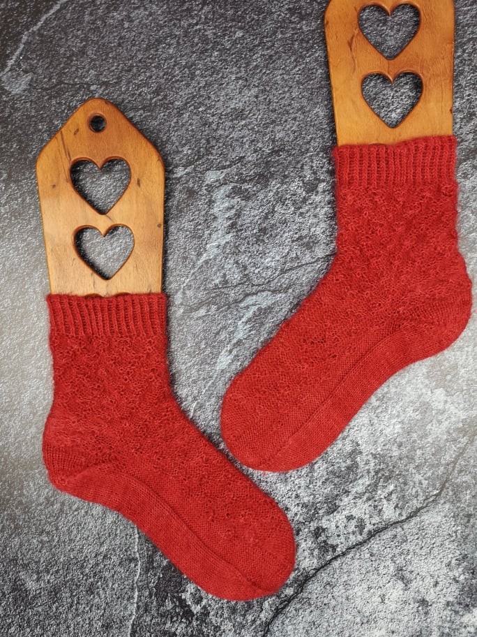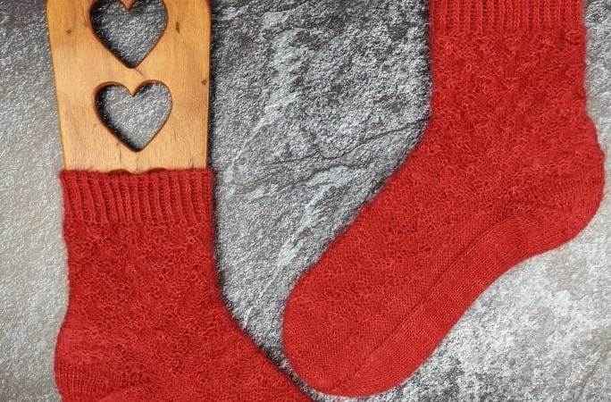 Aber auch mein Paar Socken aus der Cuthbert Sock trage ich wirklich gerne, denn es ist wunderbar wärmend! Durch den Mohair Anteil flauscht das Garn sehr stark, vor allem an den beim Tragen durch Reibung belasteten Stellen. Das sorgt dafür, dass die Socken relativ schnell ein bisschen „oll“ aussehen, da sie wirklich stark flauschen, aber das ist bei Mohair halt absehbar und tut aus meiner Sicht auch dem Tragekomfort keinen Abbruch. Hätte ich Stinos und keine Mustersocken gestrickt, würde der zunehmende Flausche vermutlich auch nicht so stark auffallen. Das ist für mich absolut kein Makel und das Garn ist in meinen Augen trotzdem super für Socken geeignet.