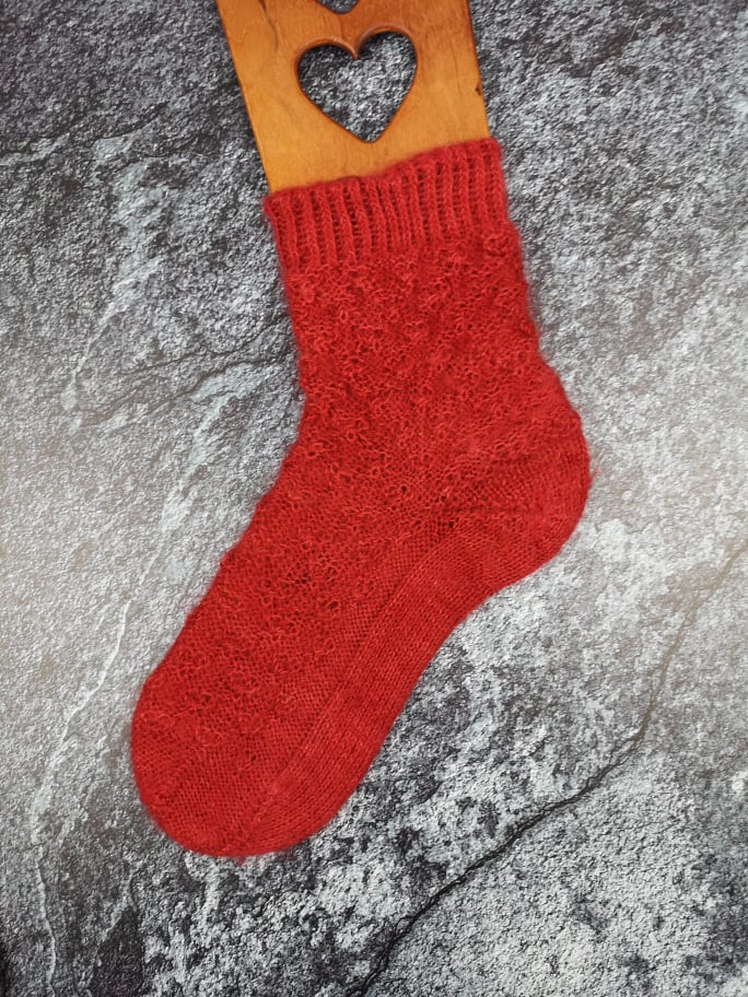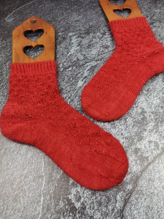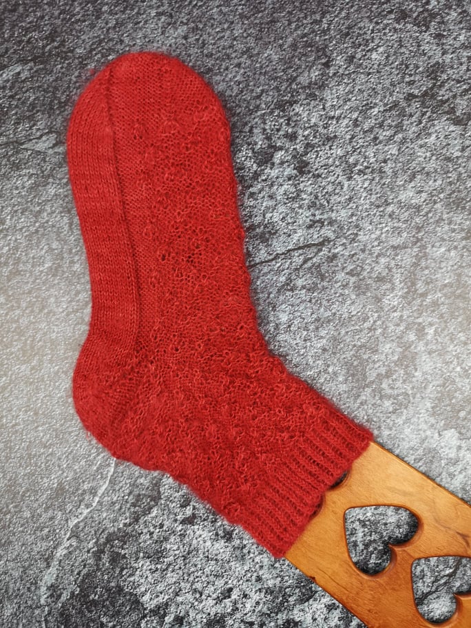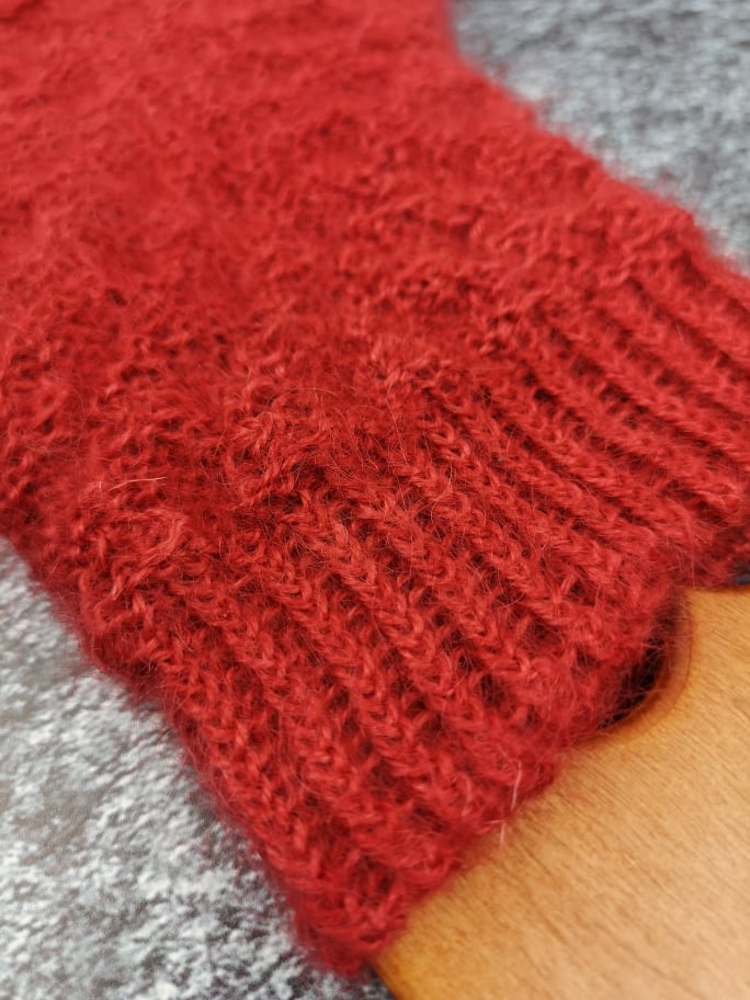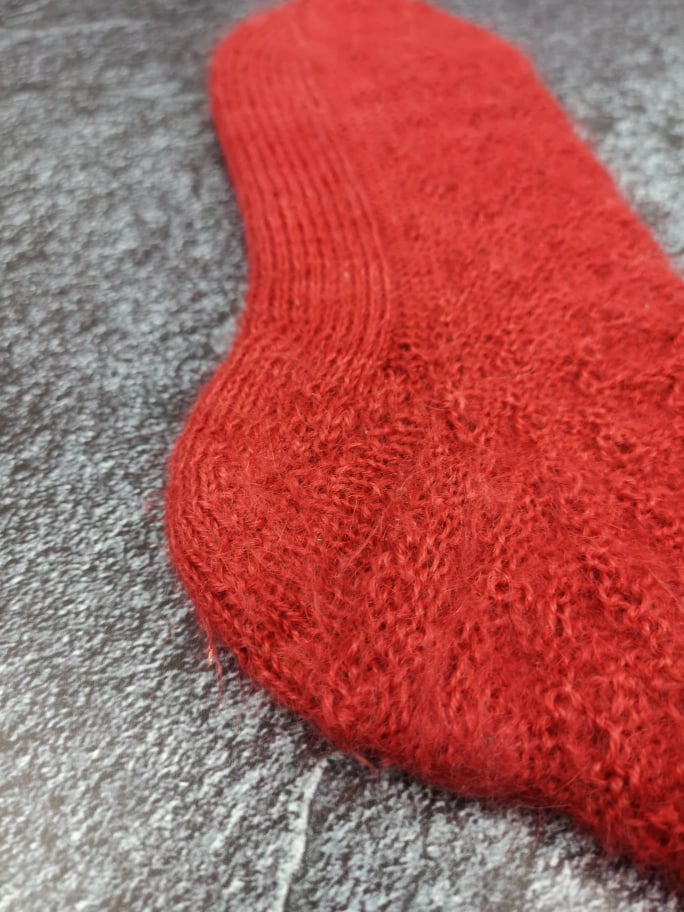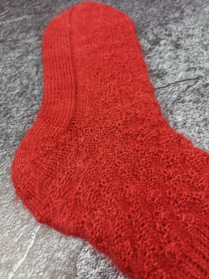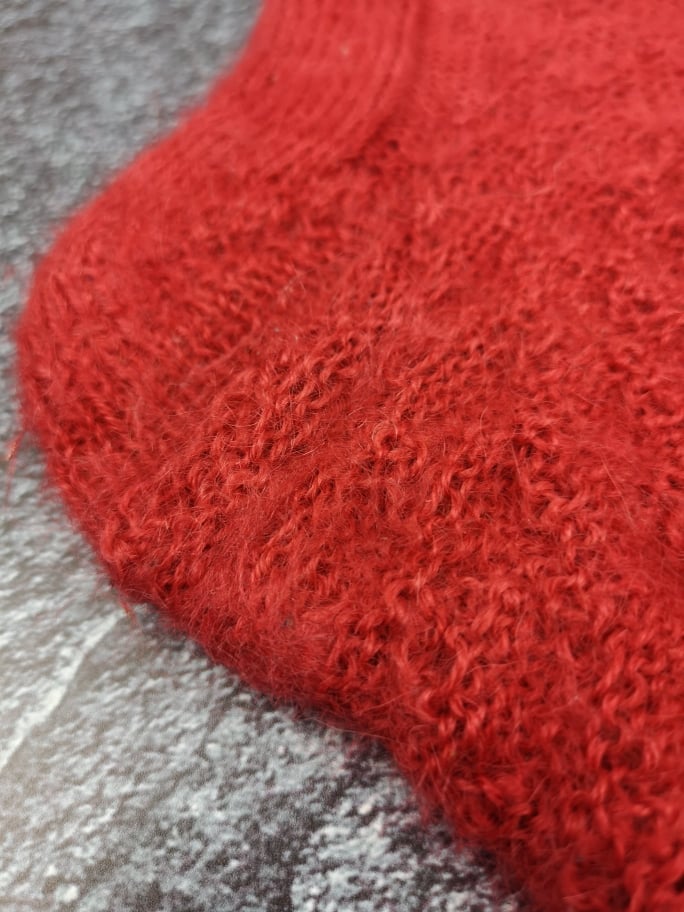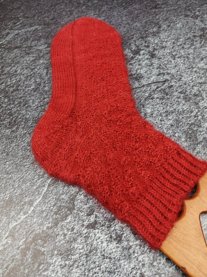 Außerdem war ich durch das Muster an eine bestimmte Maschenanzahl gebunden, was dafür gesorgt hat, dass die fertigen Socken nicht ganz so ideal sitzen. Das Garn ist mit 300m auf 130g etwas dicker als die übliche 4fädige Sockenwolle – aber nicht so stark, wie man vermuten könnte, denn Mohair ist einfach ziemlich schwer. Ich habe trotz der auf der Banderole empfohlenen 3mm mit 2mm Nadeln gestrickt. Da das von mir verwendete Muster für klassisches 4fach Garn ausgelegt war, sind mir die fertigen Socken – erwartbar – etwas zu groß. Das nächste Paar würde ich definitiv nach der Fish Lips Kiss Heel Methode [Achtung ravelry Link] auf meinen Fuß passend und enger anliegen stricken.